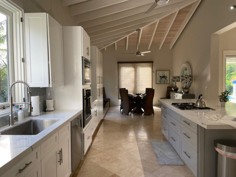 The pool veranda opens off the living, dining, and owner’s suite. Beach equipment provided: cooler, snorkel gear, beach umbrella, tent and chairs.