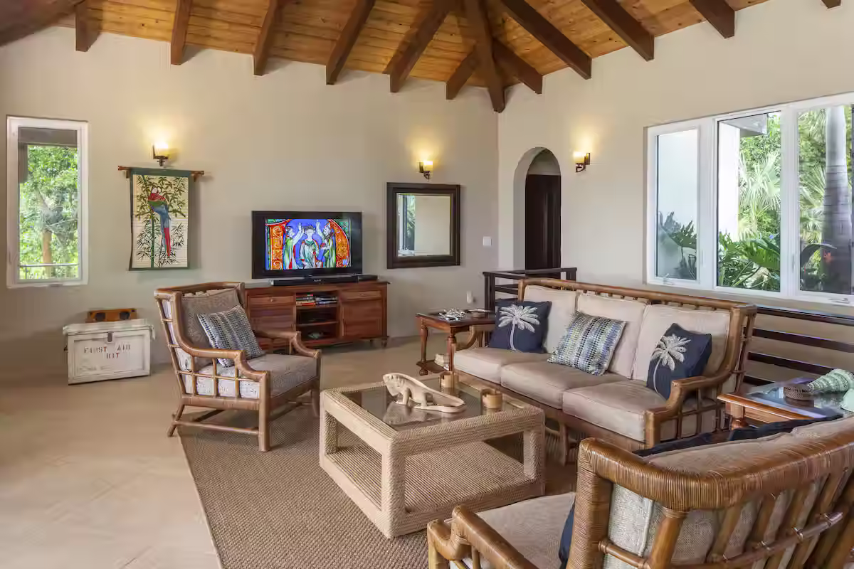 Life can be slowly savored at Palm Ridge Villa, morning coffee on the decks, a rum and tonic by the infinity edge pool in the tropical sun, a canopy of a million stars at night. Located on the ridge of Majestic Mile in Upper Carolina. We have an upper roof deck with amazing views of St. John and British Virgin Islands. Beautifully landscaped villa with stunningly detailed woodwork. The covered deck behind pool provides shade all day.