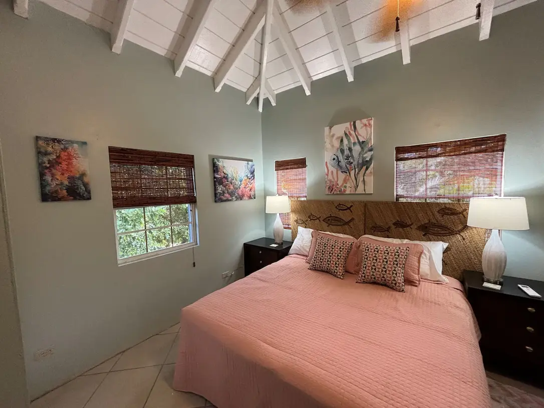 Sol Cottage Villa offers 2 bedrooms including a queen on the main floor, and a king or optional two twin beds on the second floor. The cozy full bathroom features a screened top (to keep pesky bugs out) and an island stoned outdoor shower.