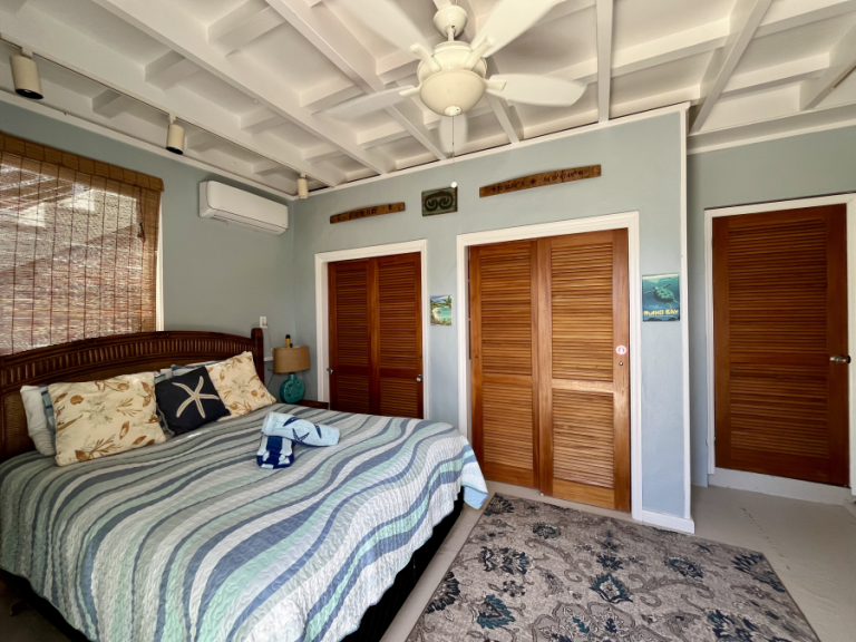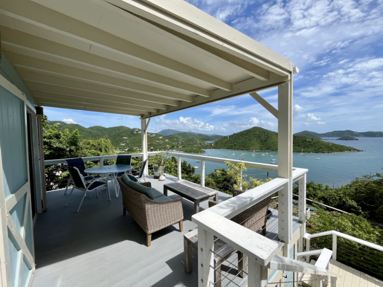 The upper deck provides a casual seating area coupled with “al fresco” dining for four while the lower sun deck is just outside the Master bedroom; both providing a scenic view of the sailboats coming to harbor in Coral Bay.