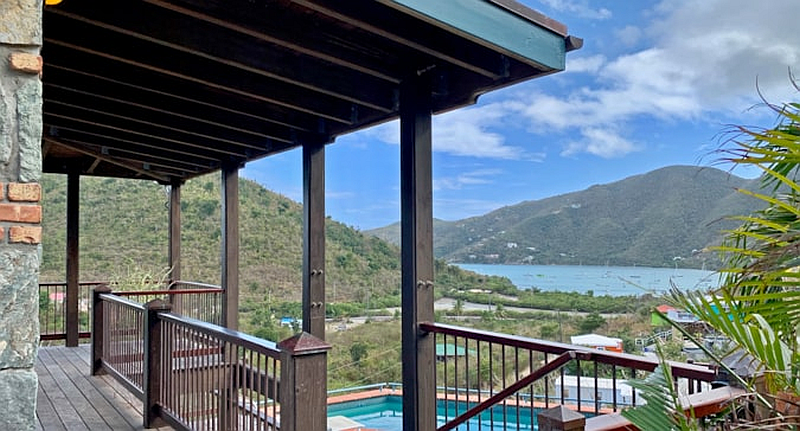 The main living area is equipped with AC and also features two large screened slider doors that look out over Coral Bay and allow the trade winds to circulate throughout. Exit through the glass sliders out onto the wrap around porch on the upper level where you can enjoy coffee in the morning while watching the sunrise over East End.